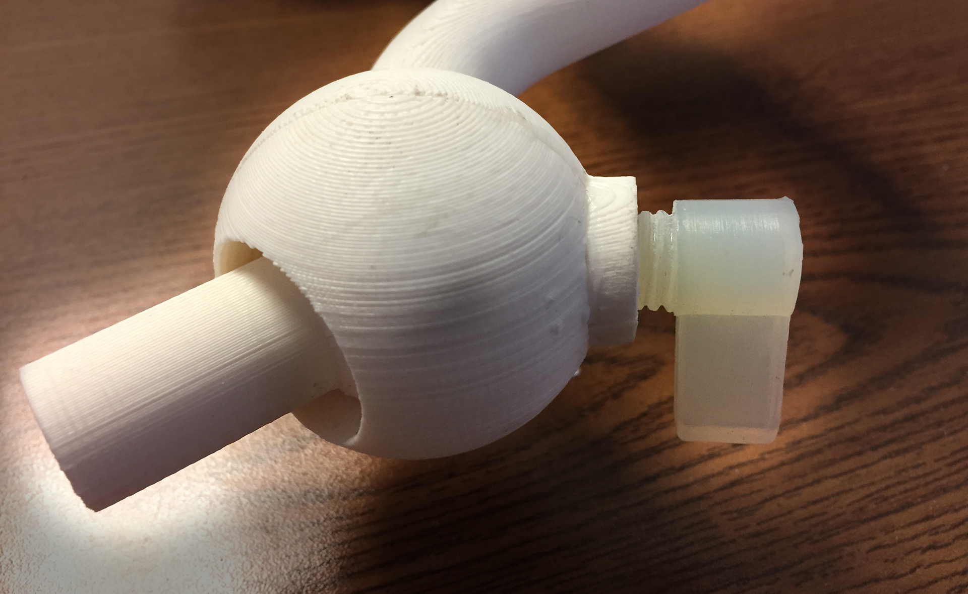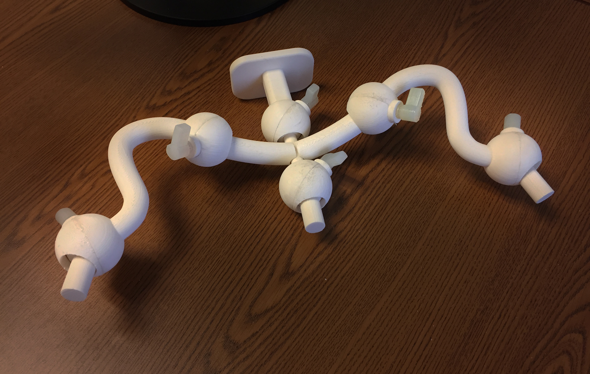 Multi axis underpinnings to a larger product. The toughest part of this was developing a functional, locking ball joint(seen closer below) which could be 3D printed and still able to hold the weight of each section up. After a few test joints, the final used an entirely ABS construction, minus Form's polypropylene- like resin for the screws themselves to help grip the inner joint.