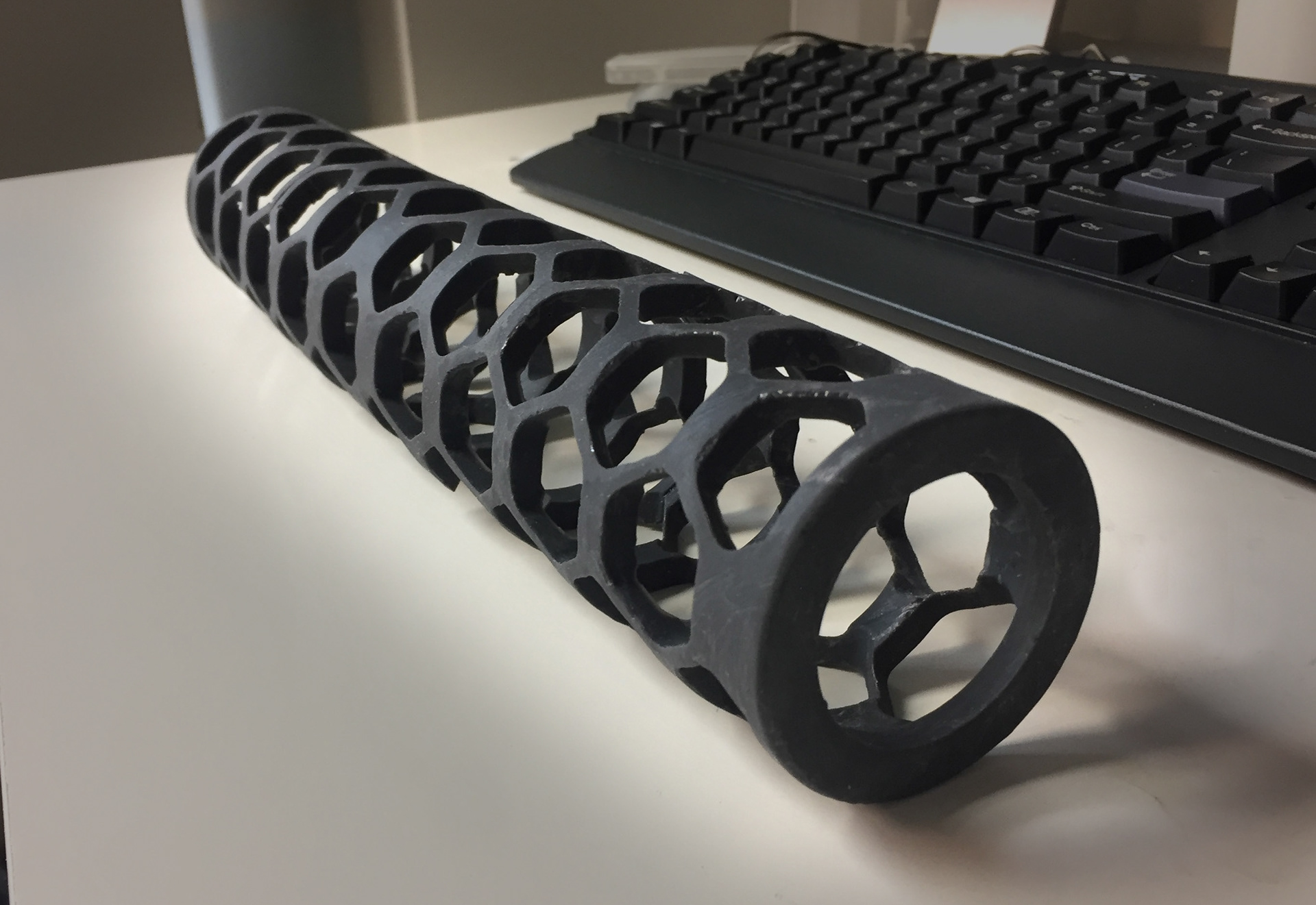 A universal fit gun scope protector. Modeled in Rhino 5, printed on a Form2 printer in flexible resin in 3 parts and epoxied together with metal dowels.