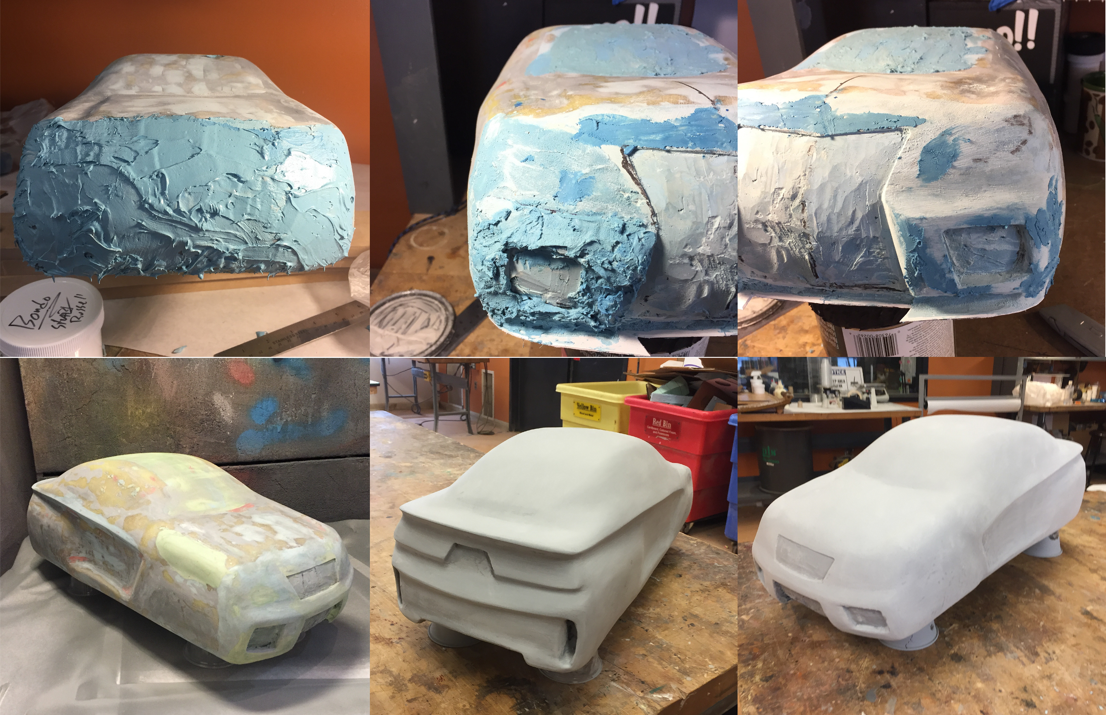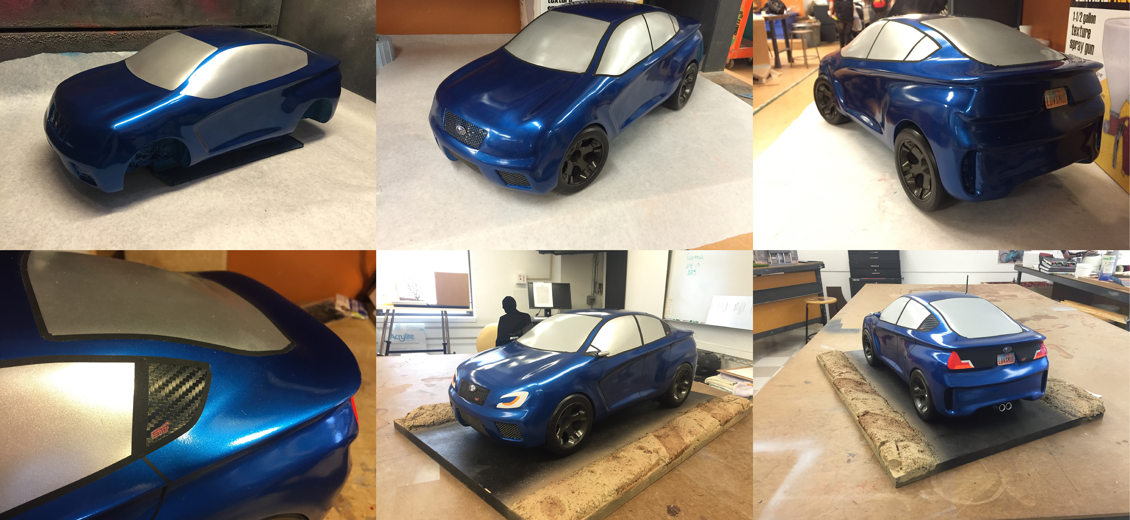 Final Appearance model for a transportation design class. Started off with an 1/4" acrylic sheet cut and sanded to the shape of the vehicle's A-Line, I then glued polyurethane foam onto either sides of the acrylic and began to shape the rough details and shape of the vehicle. The form was then covered in wood glue to seal the foam before covering the entire form in 5 layers of 10 ounce fiberglass. From this point the form was sanded and shaped using polyester body filler where needed. Finally a few heavy coats of polyester filler primer were laid down, sanded and the vehicle was painted and the final details were added, such as graphics, window and door seems, lathed and polished aluminum exhaust pieces and steel mesh grills.